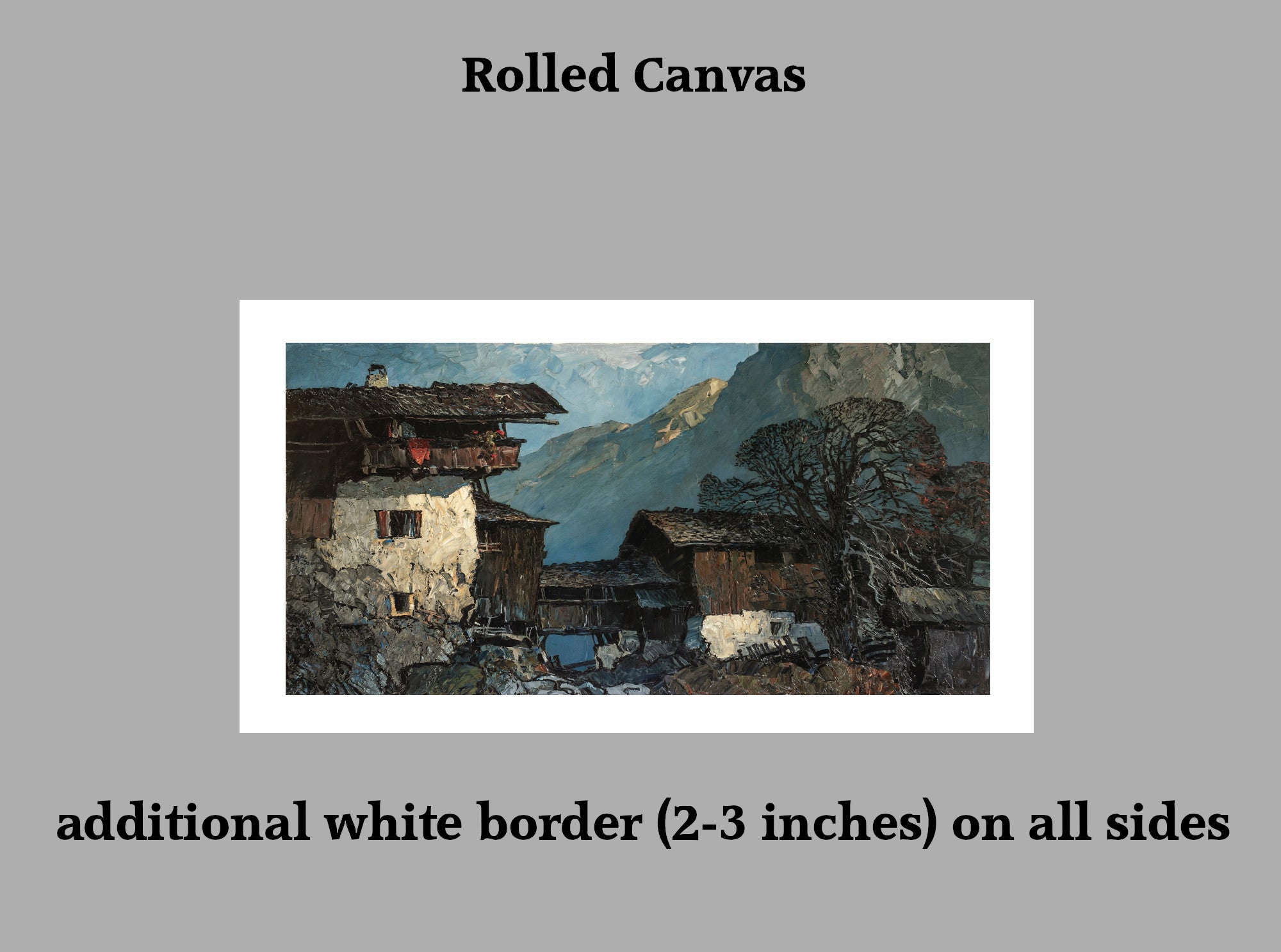 Rolled canvas options have an additional white border of approximately 2.5 inches (7cm) on all 4 sides to aid stretching.
