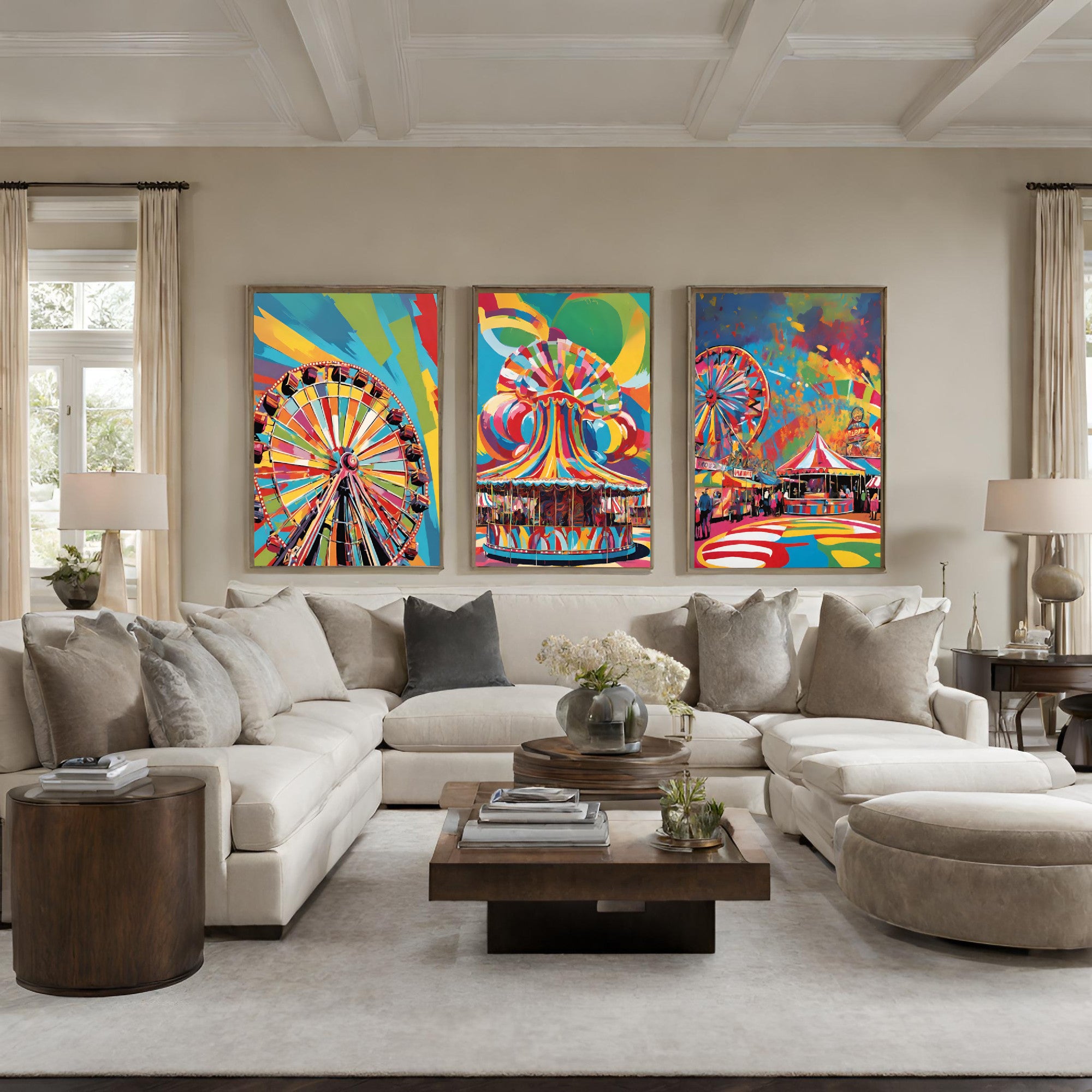 This set of 3 fairground and carnival-themed art prints feature bold colors and intricate details. Each print is printed on high-quality, acid-free, archival paper or canvas for lasting vibrancy. Hang these prints to add a touch of vibrancy and style to any wall.