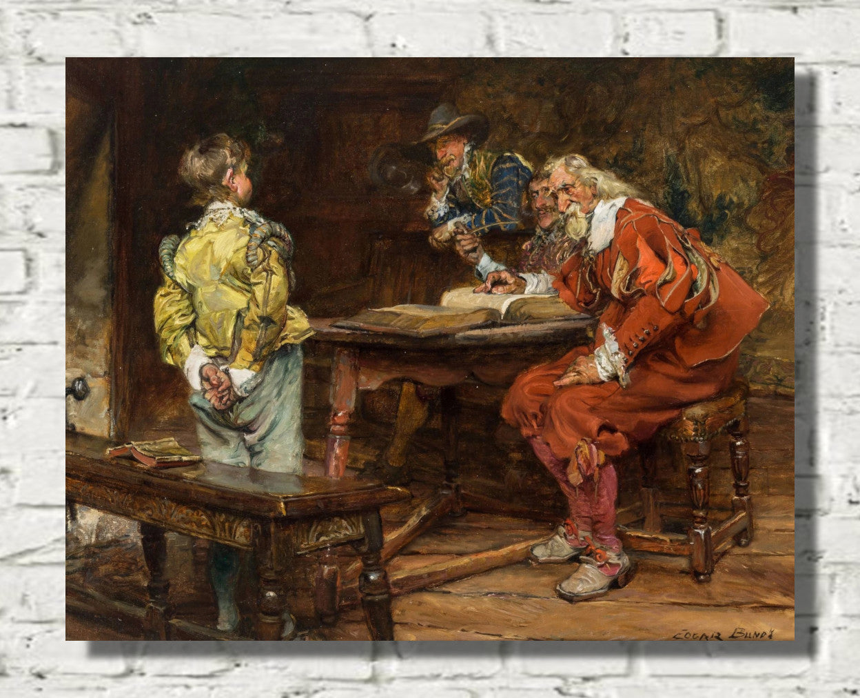 "The Armourer" by Edgar Bundy is a captivating oil painting that portrays a scene from medieval times. The central focus is on a skilled armourer meticulously crafting armor, surrounded by tools and materials. The painting exudes a sense of craftsmanship and dedication to the art of armoring.