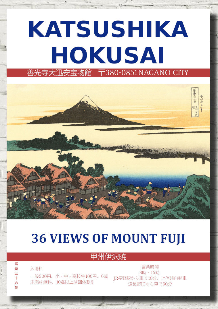 An exhibition poster featuring one of the 36 views of Mount Fuji by Katsushika Hokusai with details of the venue, Zenkō-ji Temple, in Nagano City, Japan.