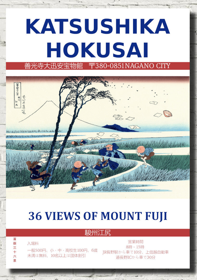 An exhibition poster featuring one of the 36 views of Mount Fuji by Katsushika Hokusai with details of the venue, Zenkō-ji Temple, in Nagano City, Japan.
