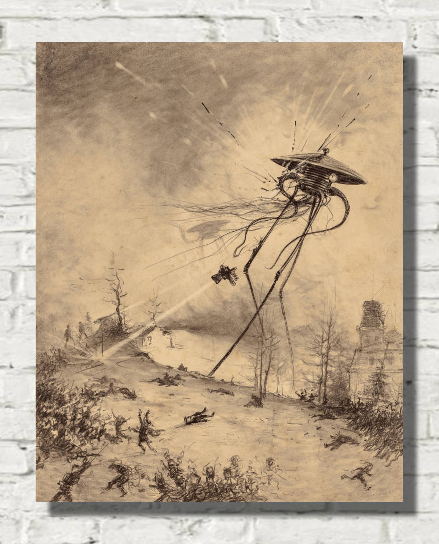 Transform your space with these hauntingly beautiful reproductions of Henrique Alvim Corrêa's legendary 1906 illustrations for H.G. Wells' "The War of the Worlds." Each print captures the dark, biomechanical essence of Wells' Martian invaders through Corrêa's uniquely disturbing Victorian-era vision. These museum-quality reproductions preserve every intricate detail of the original sketches, from the menacing tentacles of the alien machines to the dramatic Victorian landscapes they tower over.