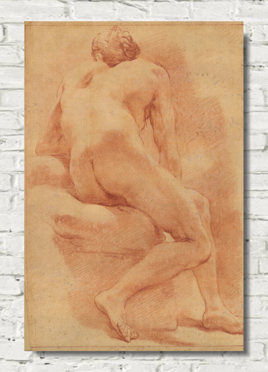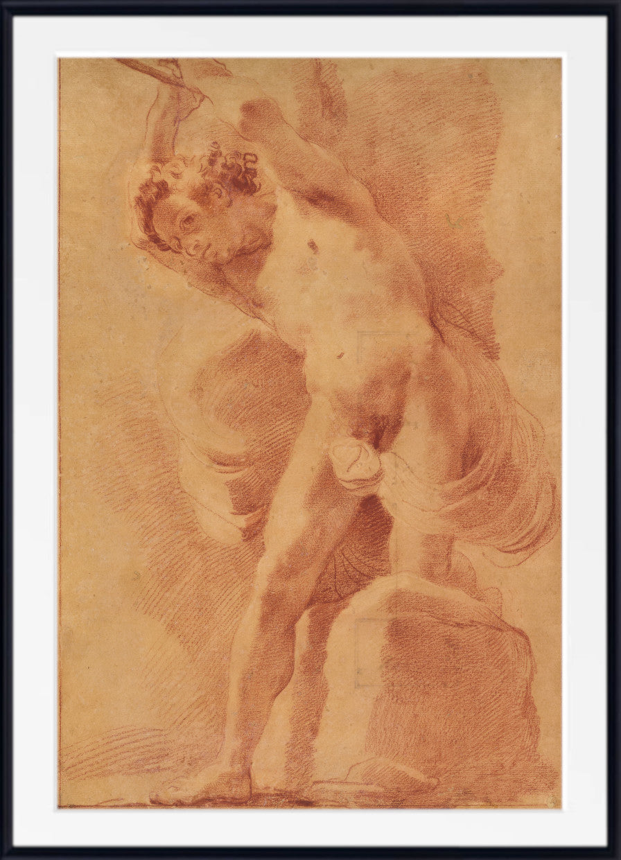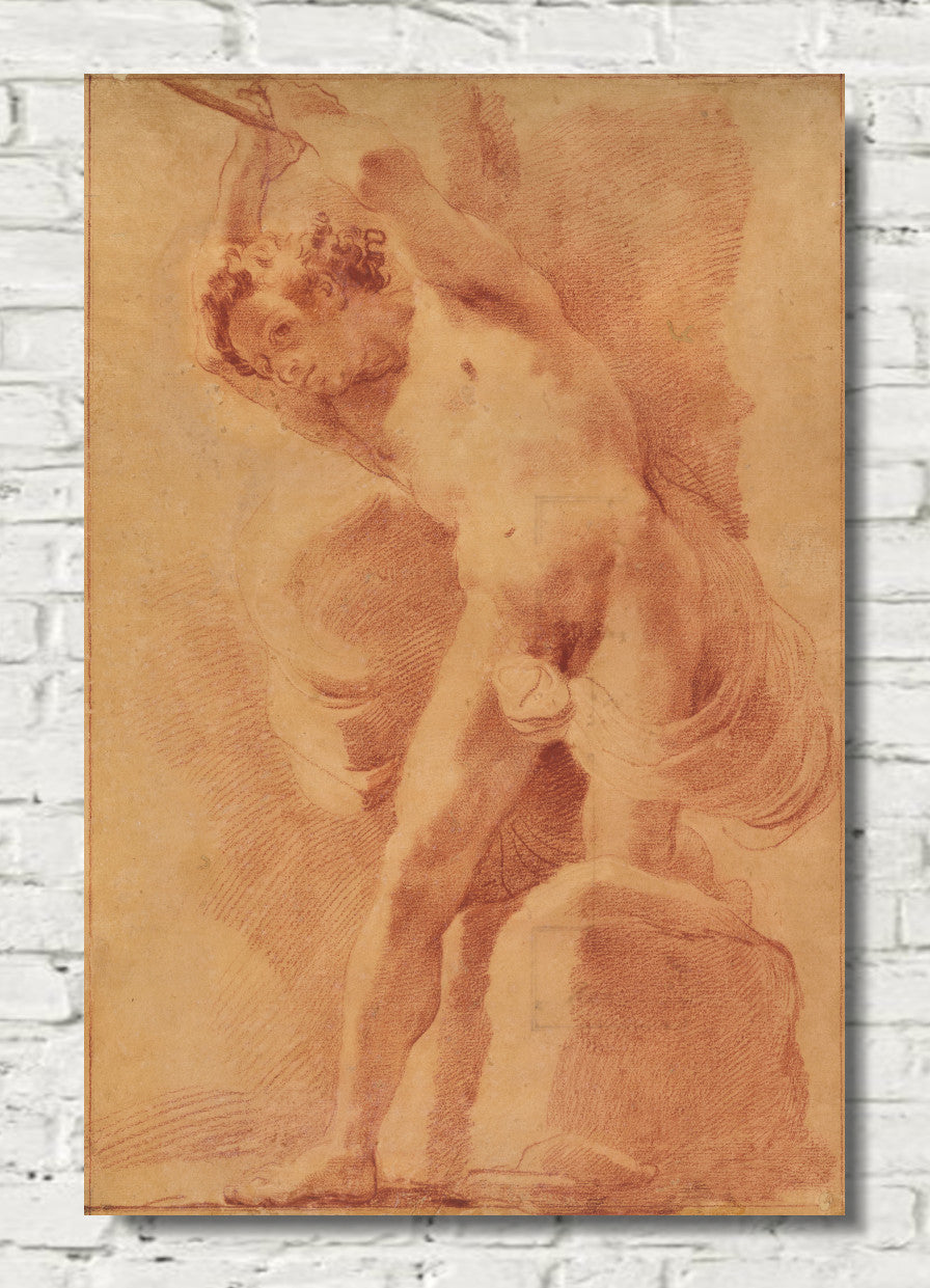 In Ubaldo Gandolfi's "A Male Nude Seen from the Front (St. Sebastian)," the Italian Baroque artist masterfully captures the serene yet powerful depiction of St. Sebastian, exuding vulnerability and strength in equal measure. The figure, bathed in soft light, stands poised with a sense of graceful resignation, his muscular physique rendered with meticulous attention to detail. Gandolfi's skillful use of chiaroscuro enhances the dramatic effect, emphasizing the contrast between light and shadow to accentuate the contours of the body. With a subtle expression and eyes gazing upwards, the saint appears to transcend earthly suffering, embodying a spiritual presence that captivates the viewer's gaze. Through his nuanced portrayal, Gandolfi invites contemplation on themes of martyrdom, faith, and the human condition, leaving a lasting impression on those who behold this timeless work.