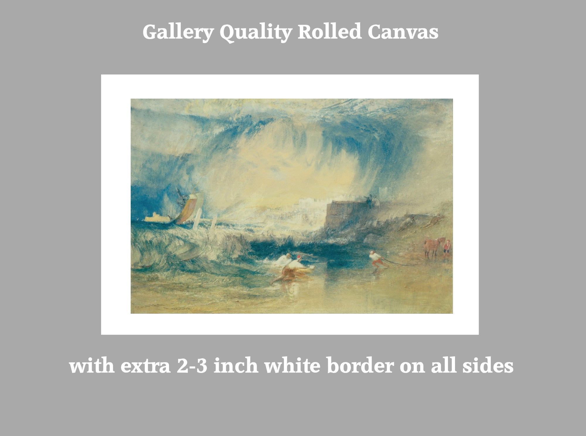 Rolled canvas options have an additional white border of approximately 2.5 inches (7cm) on all 4 sides to aid stretching.
