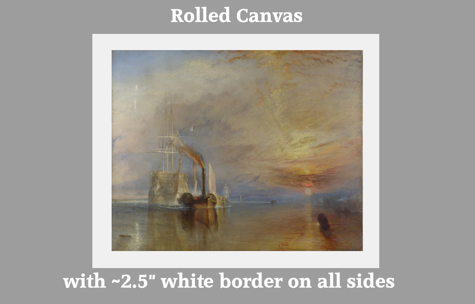 Rolled canvas options have an additional white border of approximately 2.5 inches (7cm) on all 4 sides to aid stretching.