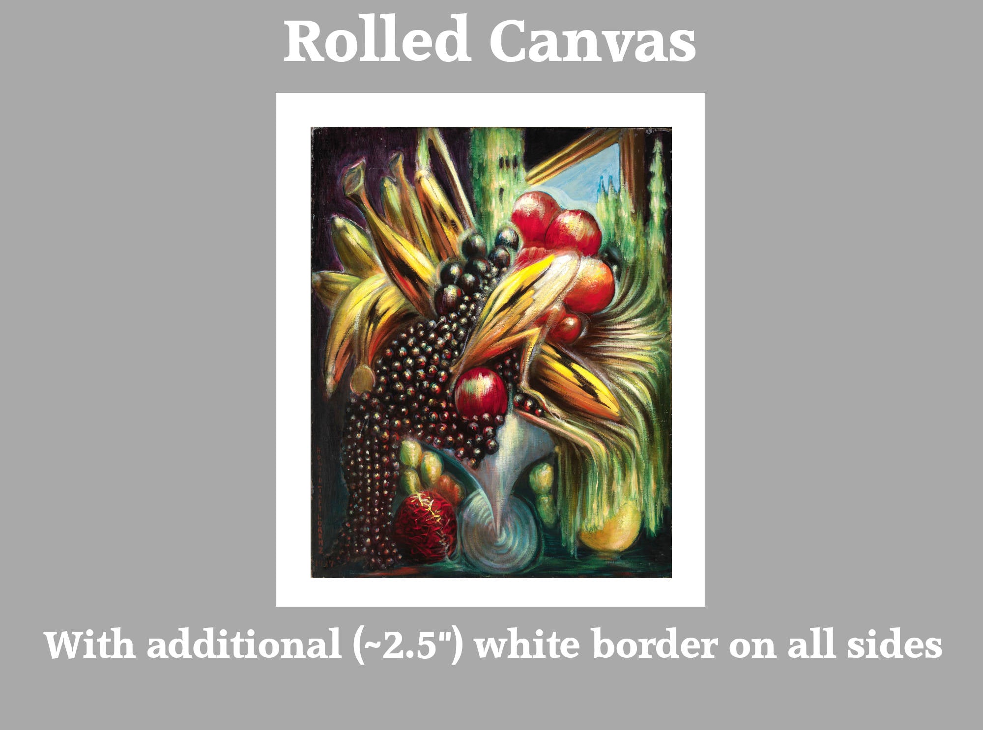 Rolled canvas options have an additional white border of approximately 2.5 inches (7cm) on all 4 sides to aid stretching.