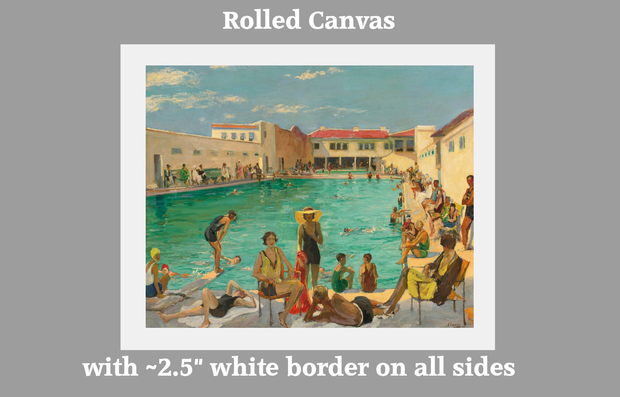 Rolled canvas options have an additional white border of approximately 2.5 inches (7cm) on all 4 sides to aid stretching.