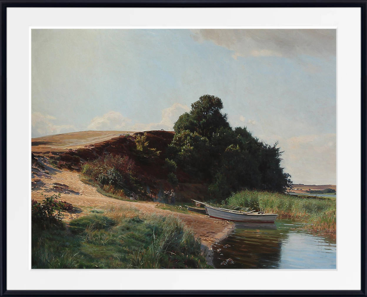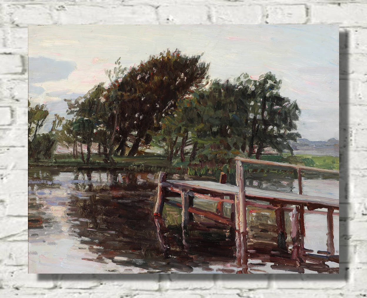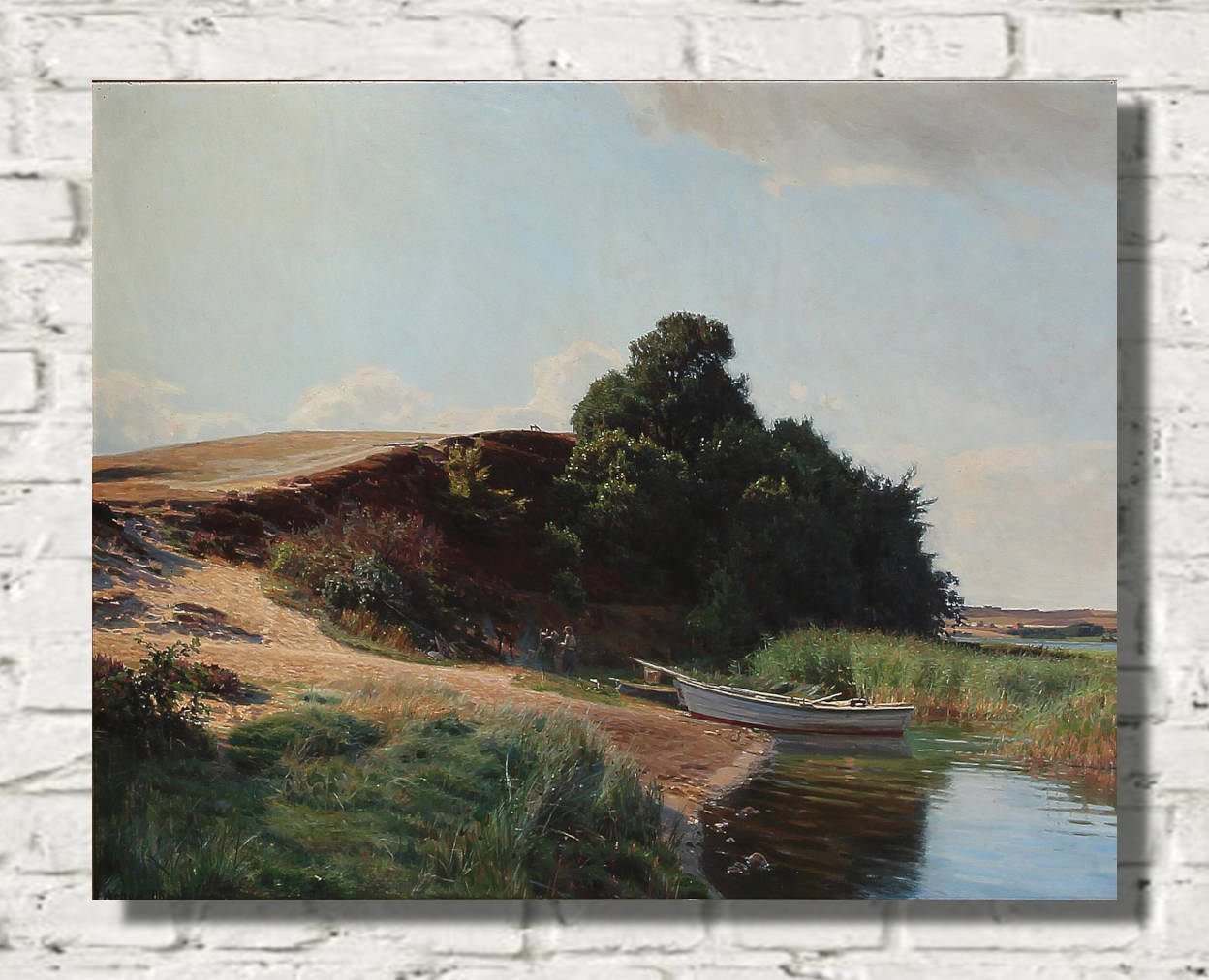 In Summer Landscape with a Thatched Farm, Achen presents a quintessential Danish rural scene. The painting features a sunlit farmhouse surrounded by lush greenery and open fields. Achen’s use of vibrant colors and soft brushwork conveys the warmth and vitality of summer. The idyllic setting, combined with his attention to architectural and botanical details, creates a nostalgic and timeless portrayal of countryside life. This work highlights Achen’s ability to evoke a sense of place and season through his art.