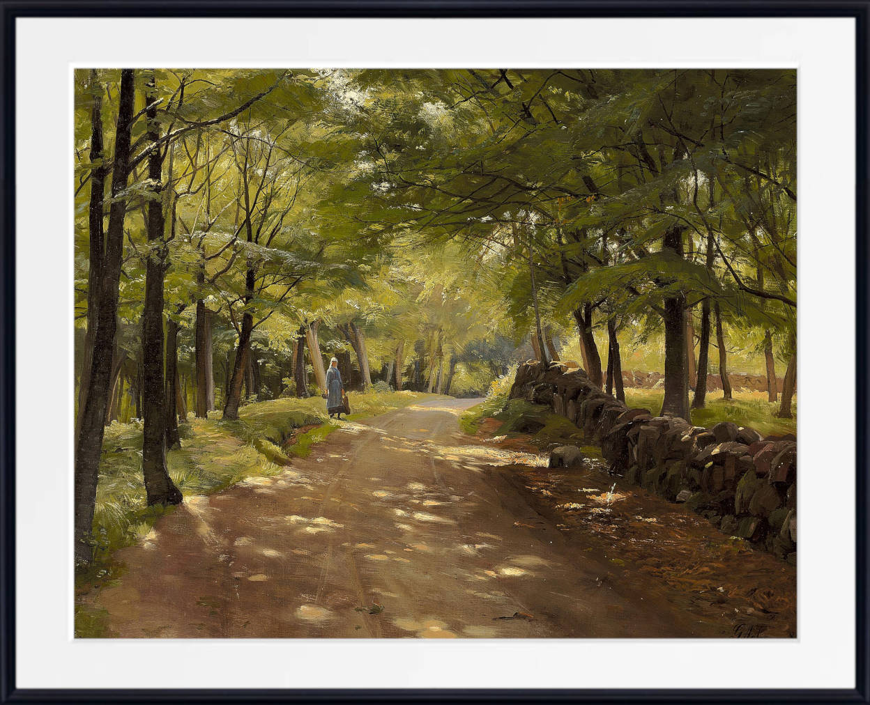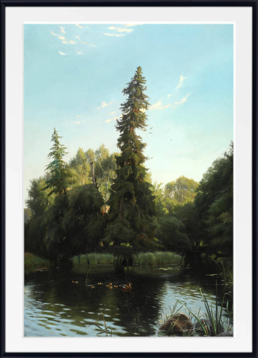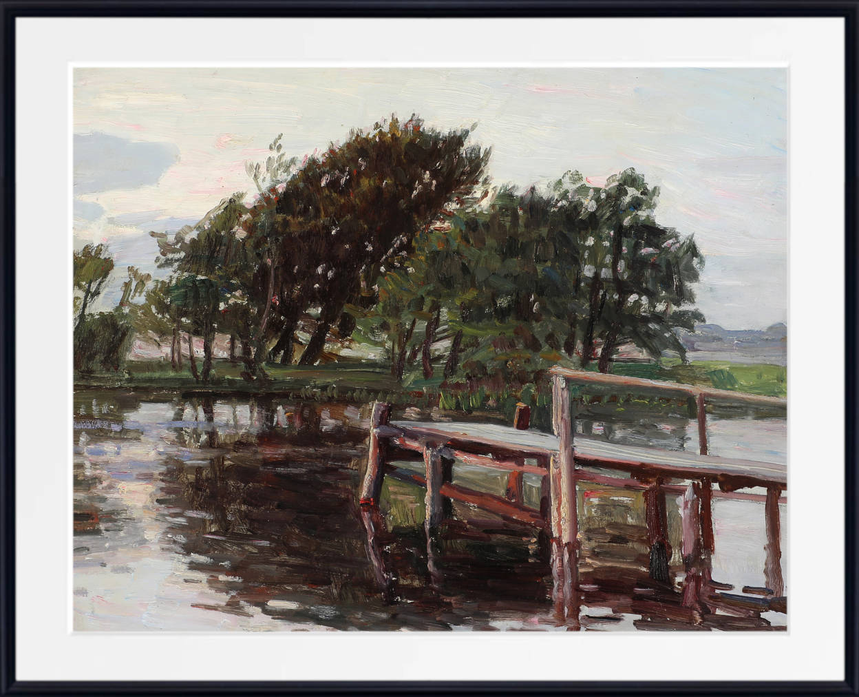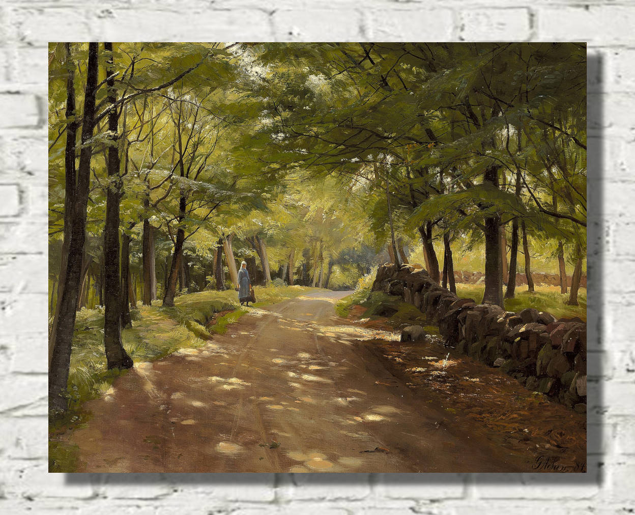 In Summer Landscape with a Thatched Farm, Achen presents a quintessential Danish rural scene. The painting features a sunlit farmhouse surrounded by lush greenery and open fields. Achen’s use of vibrant colors and soft brushwork conveys the warmth and vitality of summer. The idyllic setting, combined with his attention to architectural and botanical details, creates a nostalgic and timeless portrayal of countryside life. This work highlights Achen’s ability to evoke a sense of place and season through his art.