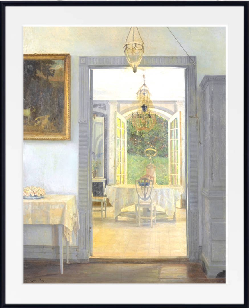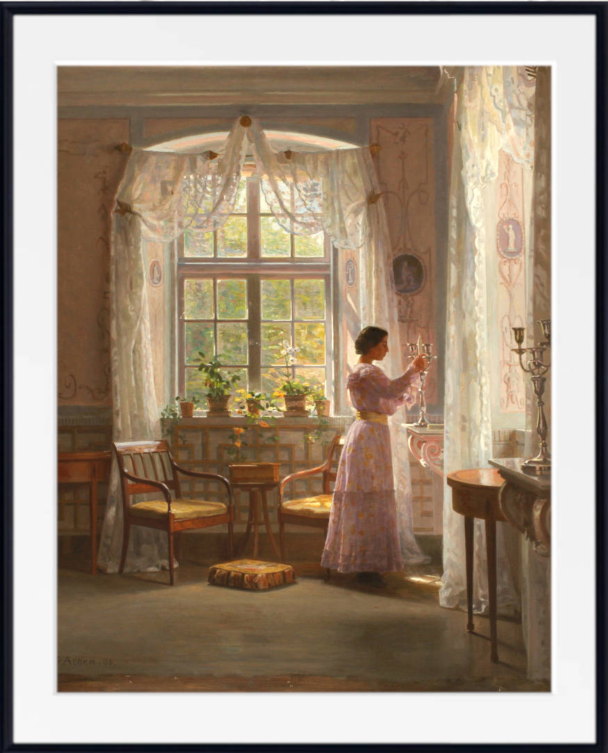 This evocative painting captures a quiet moment within the historic Liselund Castle on the Danish island of Møn. Achen’s use of soft, diffused light highlights the romantic and timeless atmosphere of the setting. The composition centers around a window, which serves as a symbolic portal to the outside world, blending interior and exterior realms. The meticulous attention to detail—from the textures of the drapery to the play of light on the furniture—demonstrates Achen’s mastery of realism and his ability to imbue stillness with emotion.