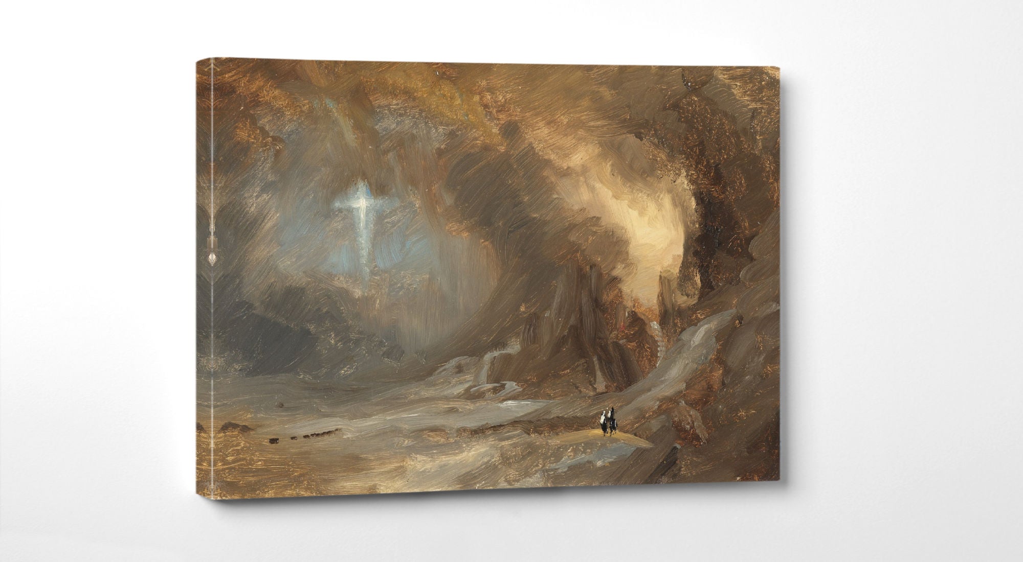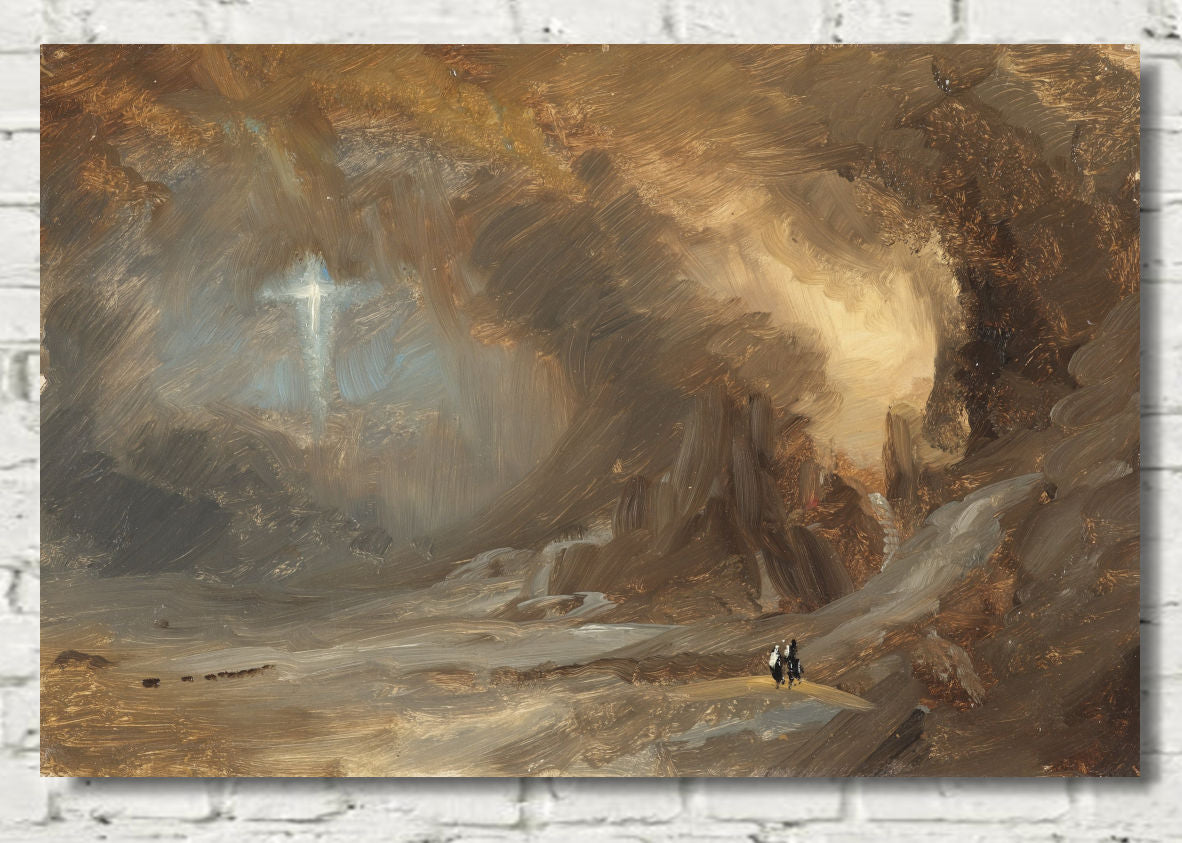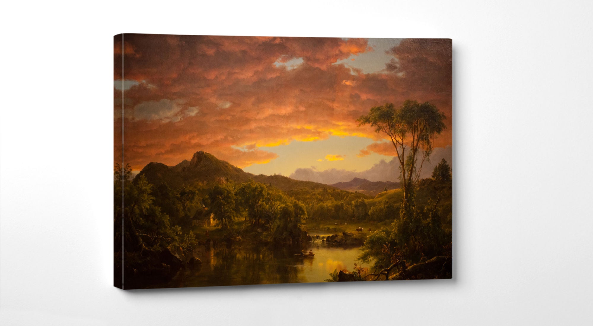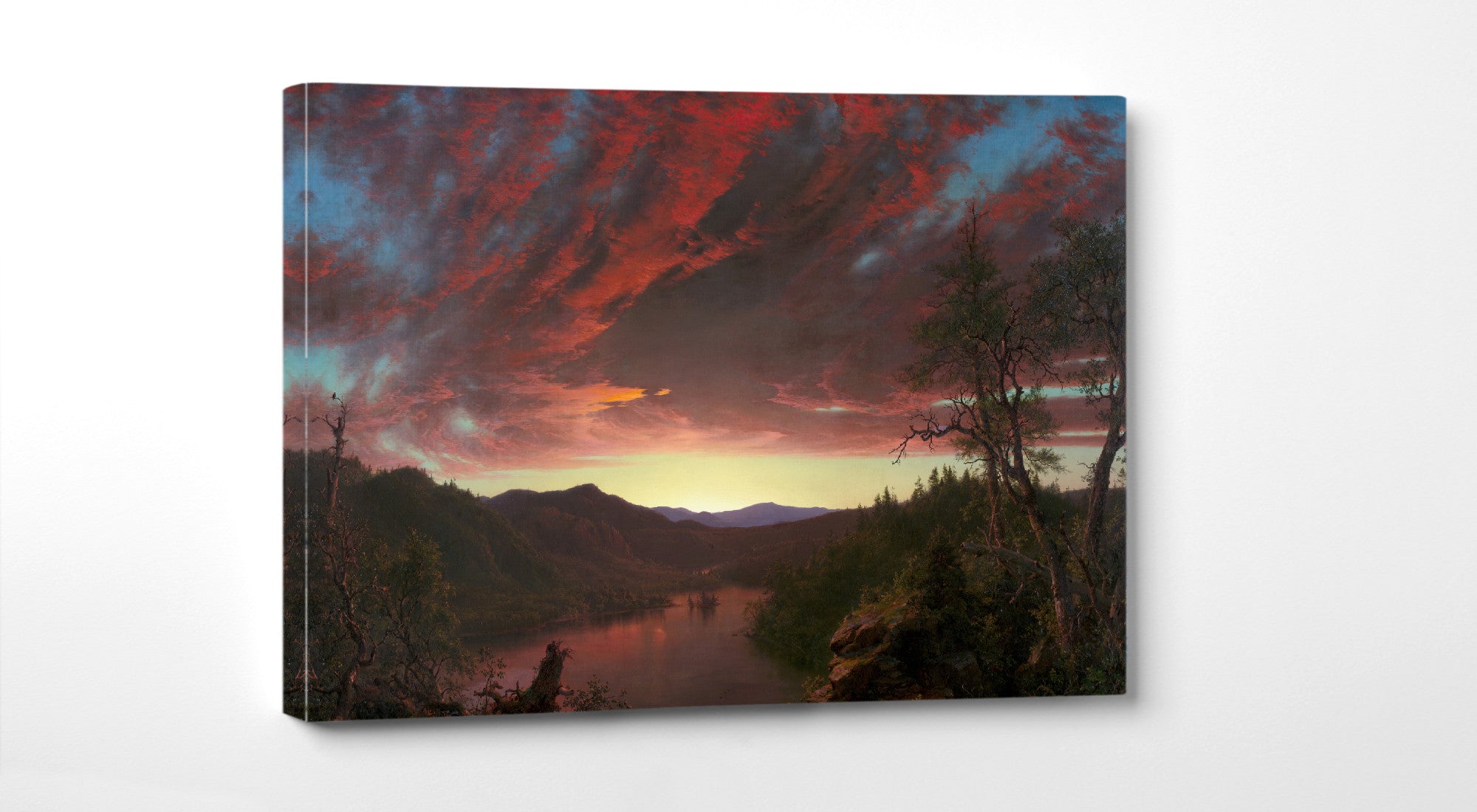 Frederic Edwin Church (May 4, 1826 – April 7, 1900) was an American landscape painter born in Hartford, Connecticut. He was a central figure in the Hudson River School of American landscape painters, perhaps best known for painting large panoramic landscapes, often depicting mountains, waterfalls, and sunsets, but also sometimes depicting dramatic natural phenomena that he saw during his travels to the Arctic and Central and South America. Church's paintings put an emphasis on light and a romantic respect for natural detail. In his later years, Church painted classical Mediterranean and Middle Eastern scenes and cityscapes.