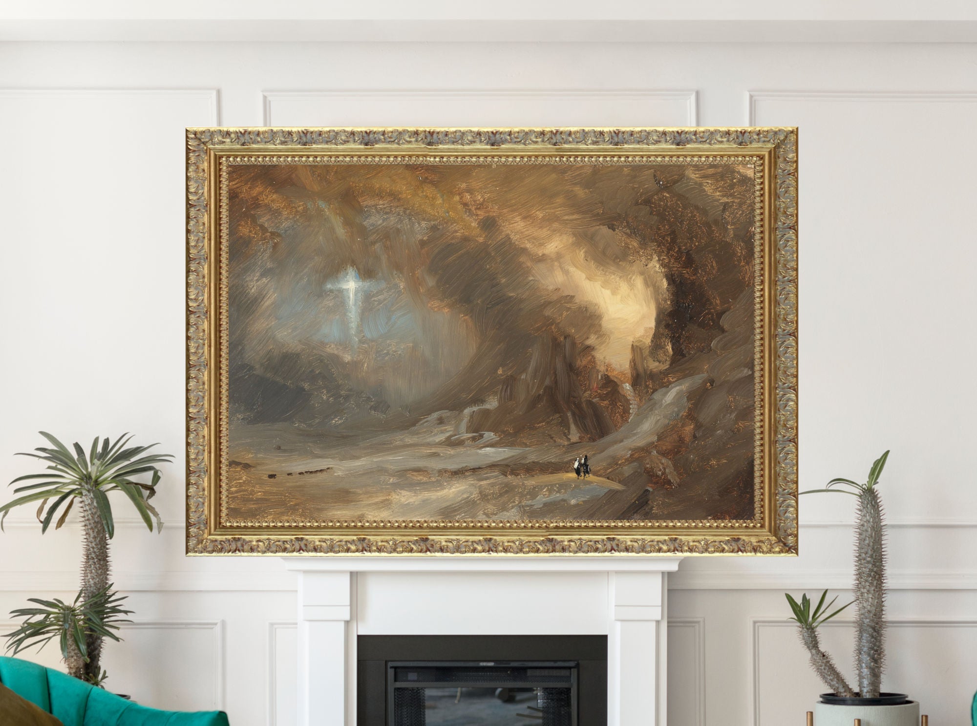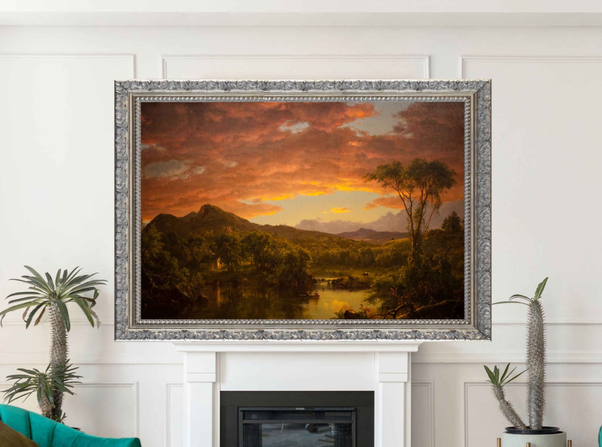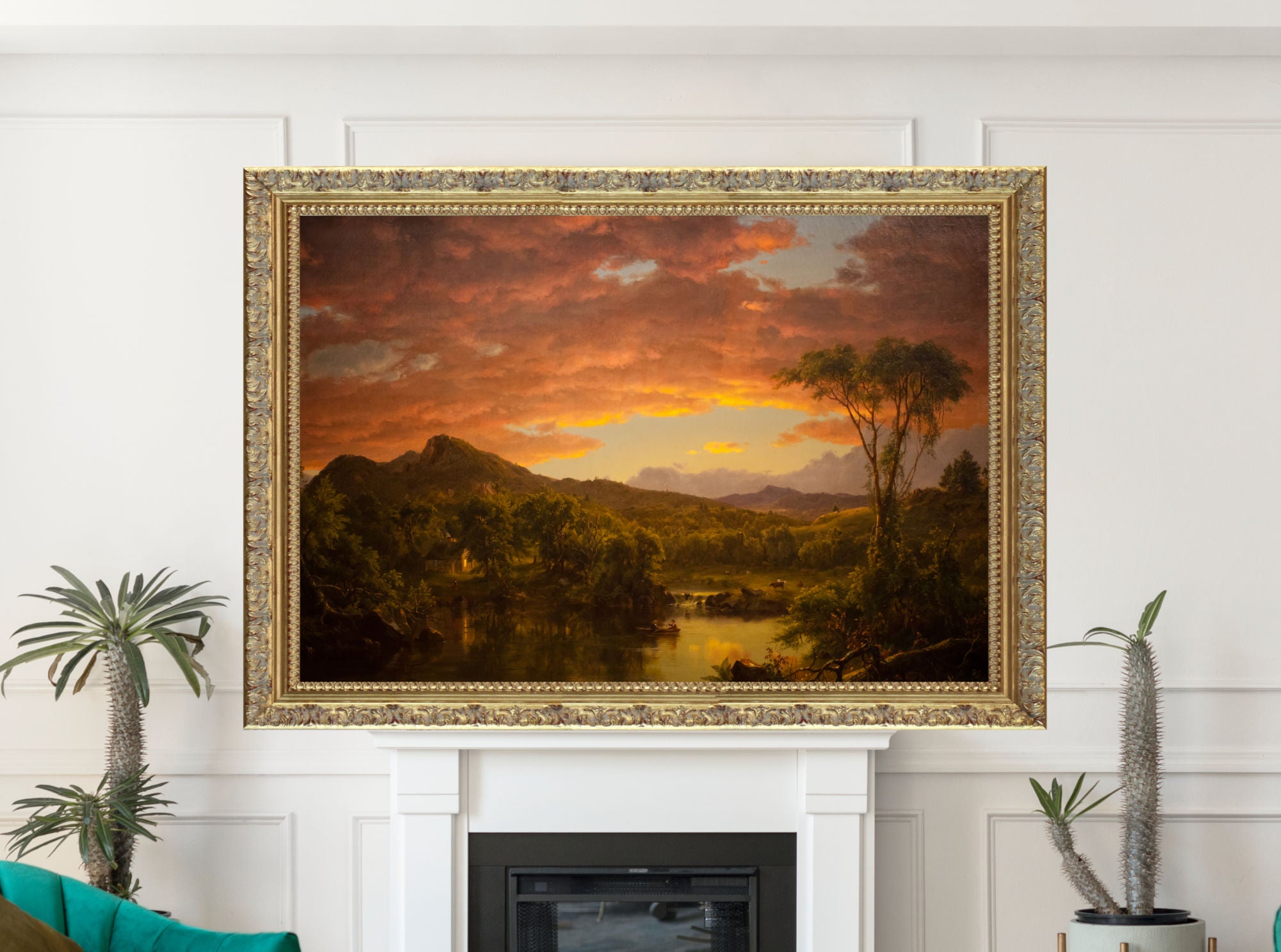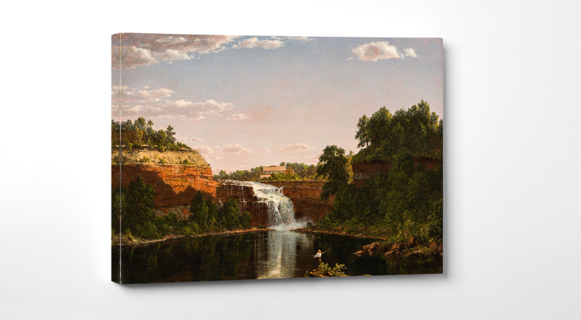 Frederic Edwin Church (May 4, 1826 – April 7, 1900) was an American landscape painter born in Hartford, Connecticut. He was a central figure in the Hudson River School of American landscape painters, perhaps best known for painting large panoramic landscapes, often depicting mountains, waterfalls, and sunsets, but also sometimes depicting dramatic natural phenomena that he saw during his travels to the Arctic and Central and South America. Church's paintings put an emphasis on light and a romantic respect for natural detail. In his later years, Church painted classical Mediterranean and Middle Eastern scenes and cityscapes.