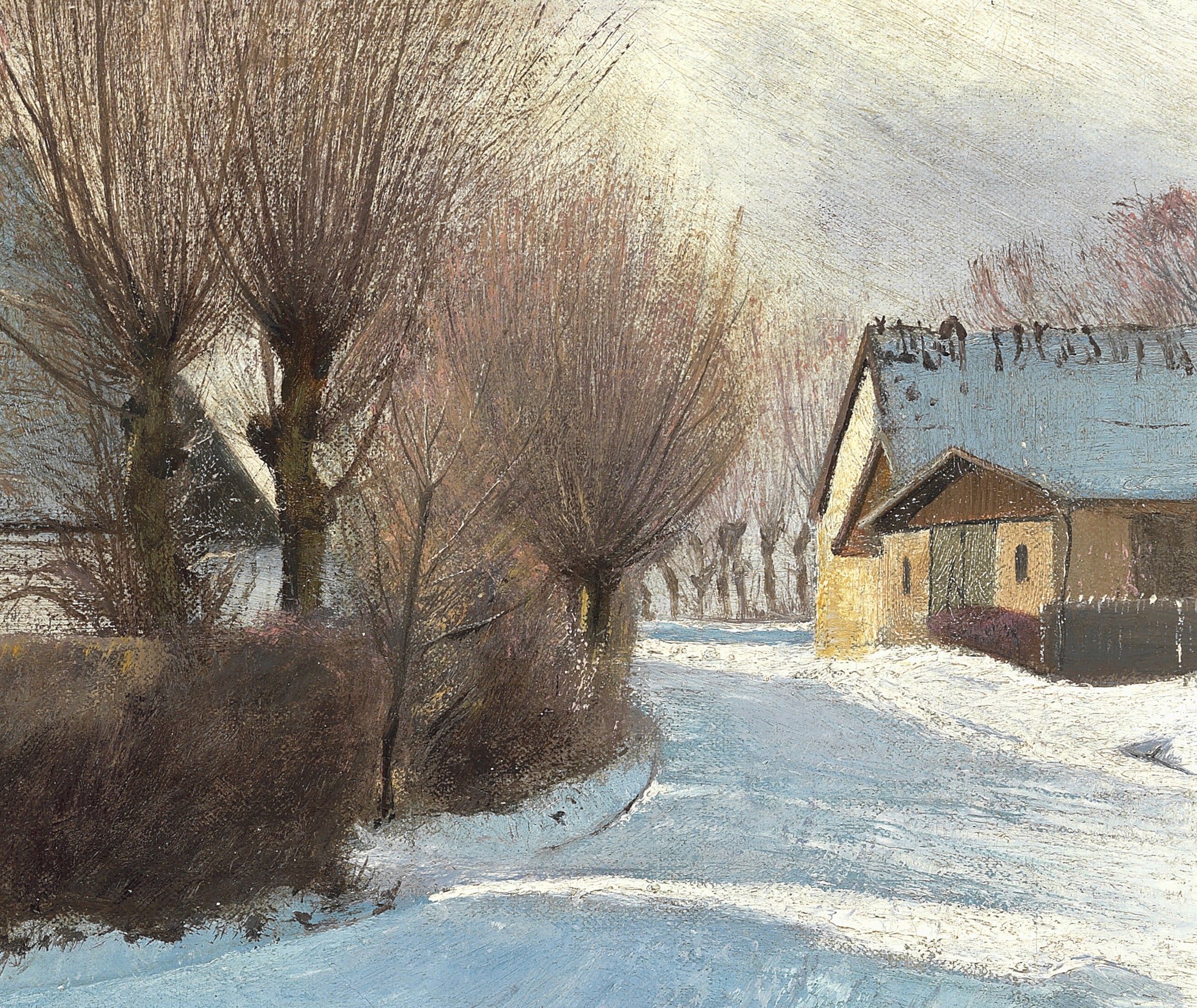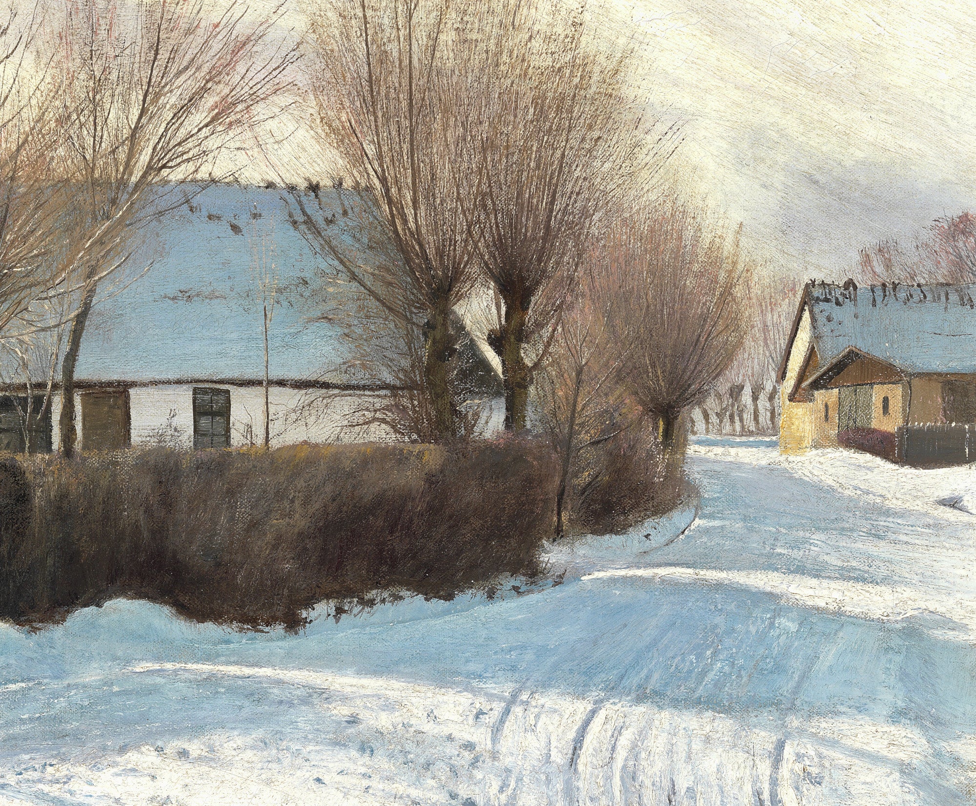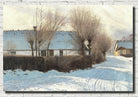 Laurits Andersen Ring Fine Art Print, Snowcovered road in Baldersbrønde with strong shadows from a whitewashed, thatched house