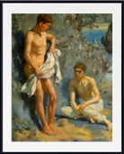 In "After the Bath (1921)" by Henry Scott Tuke, a tranquil coastal scene unfolds. A young man, seated on the beach, gazes towards a second nude figure drying off after a swim. Tuke's masterful brushwork captures the interplay of light on the figures, the soft hues of the sand, and the shimmering reflections of the sea. The composition exudes a sense of post-swim serenity, where the act of bathing becomes a moment of contemplation and connection with the natural world. The young men, rendered with Tuke's signature sensitivity, embody the timeless allure of seaside leisure, inviting viewers to share in the intimacy of this sunlit tableau.